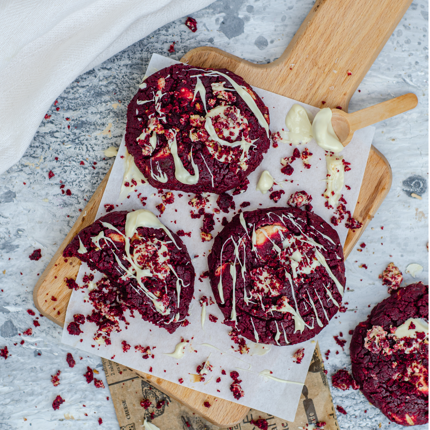 Indulge in the decadence of our Red Velvet cookie, a reddish velvet masterpiece adorned with generous chocolate chunks and a special touch of vanilla. The velvety texture and luscious cocoa undertones combine to create a sensory delight that's both visually stunning and incredibly delicious.